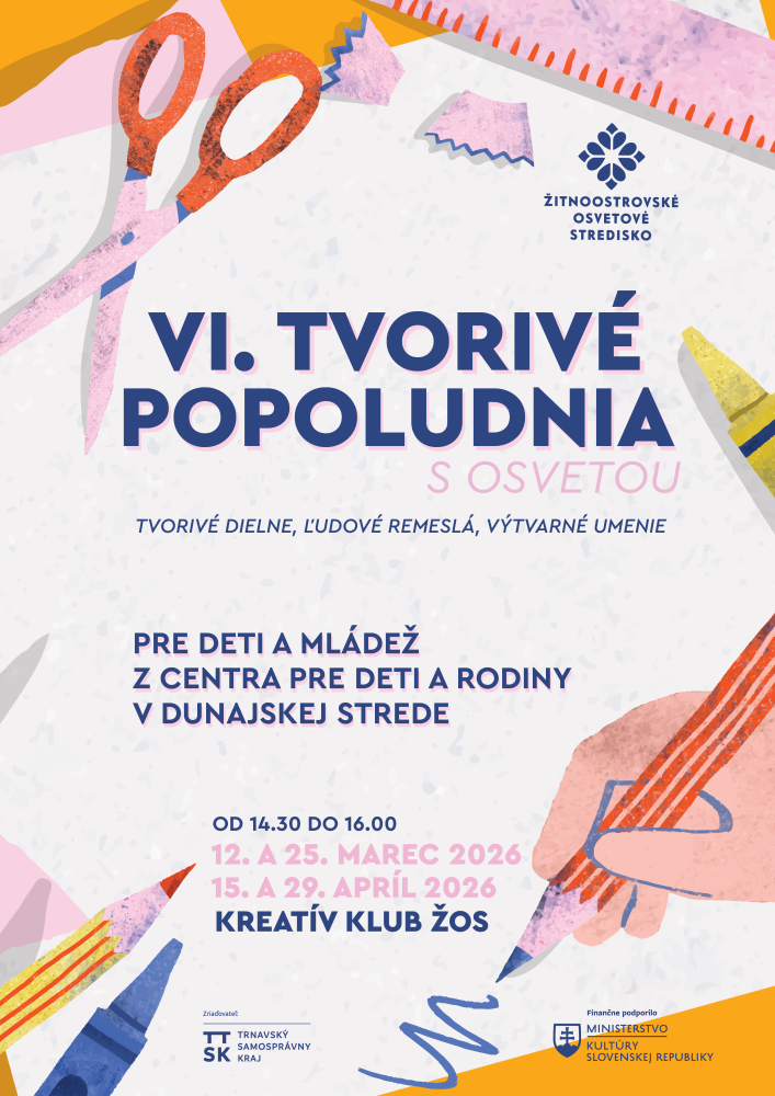 Št, 12. 03. 2026 - 14:30 Žitnoostrovské osvetové stredisko Kategória podujatia komunitné podujatie Tvorivé dielne, ľudové remeslá, výtvarné umenie pre deti a mládež z Centra pre deti a rodiny v Dunajskej Strede.